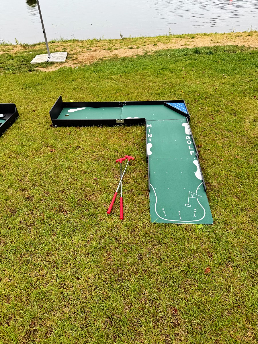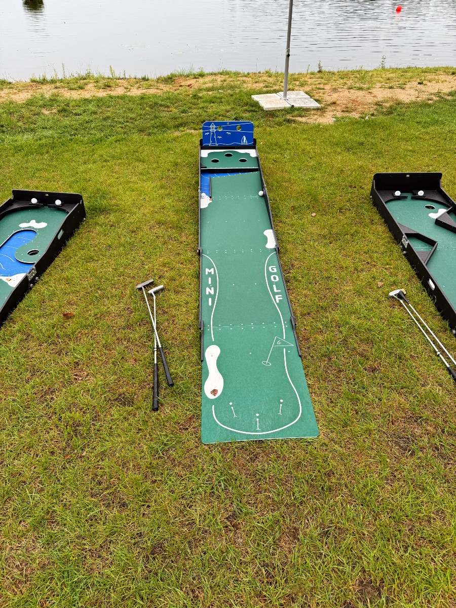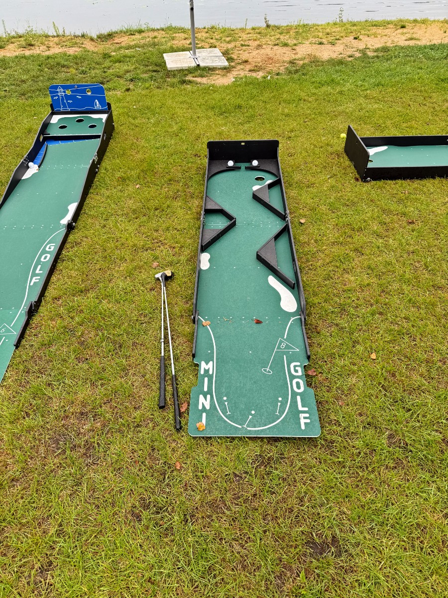 А можно взять несколько дорожек для мини гольфа, пару теннисных столов, настольный футбол, аэрохоккей или радиоуправляемые гонки, и весело отдохнуть. Дорожек хватит, чтобы все смогли поиграть.