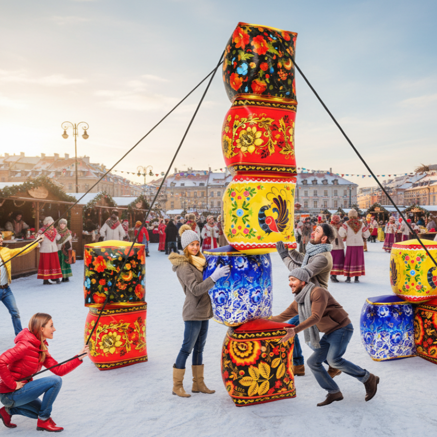 ☀️ Тотем масленичный ☀️ — это веселый командный аттракцион в ярких традиционных цветах Масленицы. Игроки совместно строят высокую башню из герметичных цветных призм, соперничая друг с другом в мастерстве и ловкости. Сложность заключается в особом порядке сборки: новую фигуру можно добавить только снизу, поднимая всю конструкцию руками и удерживая её веревочными тросиками сверху. Это отличная проверка на координацию действий команды и умение действовать сообща!